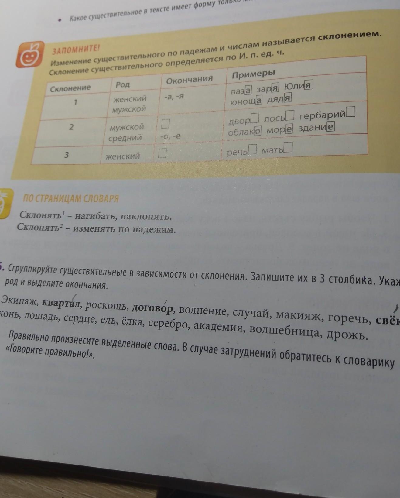 266. Сгруппируйте существительные в зависимости от склонения. Запишите их в 3 столбика. Укажите