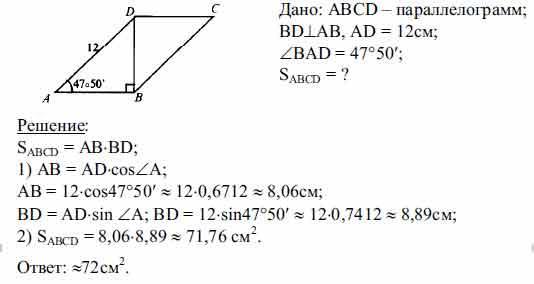 Sabcd = AB · AD · sin∠A ≈ 8,0652 · 12 · 0,7412 ≈ 71,7 см²