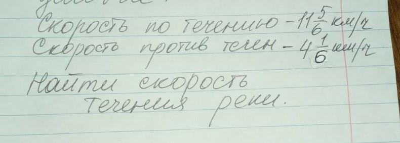Помогите! Скорость по течению- 11 5/6 км/ч. Скорость против течения- 4 1/6. Найти скорость течения реки.