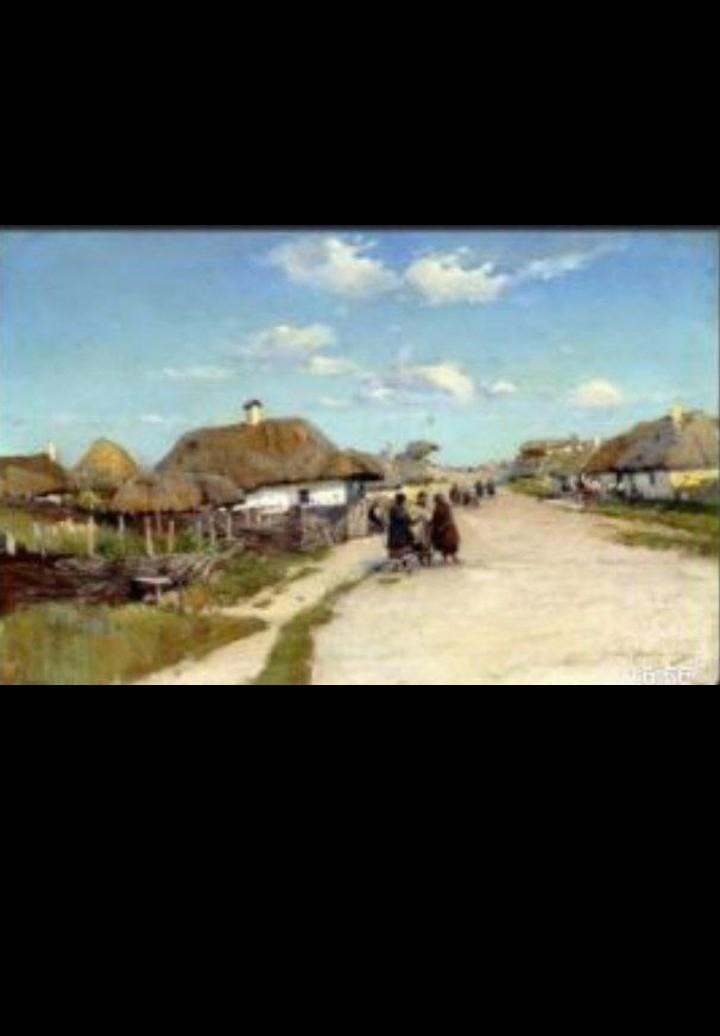 на этой картине изображено село с домами-мазанками , которые укрыты соломой . Идут простые люди по длинной дороге которая ведёт в даль , а голубое небо даёт этой картине яркости . Слышится запах лета.