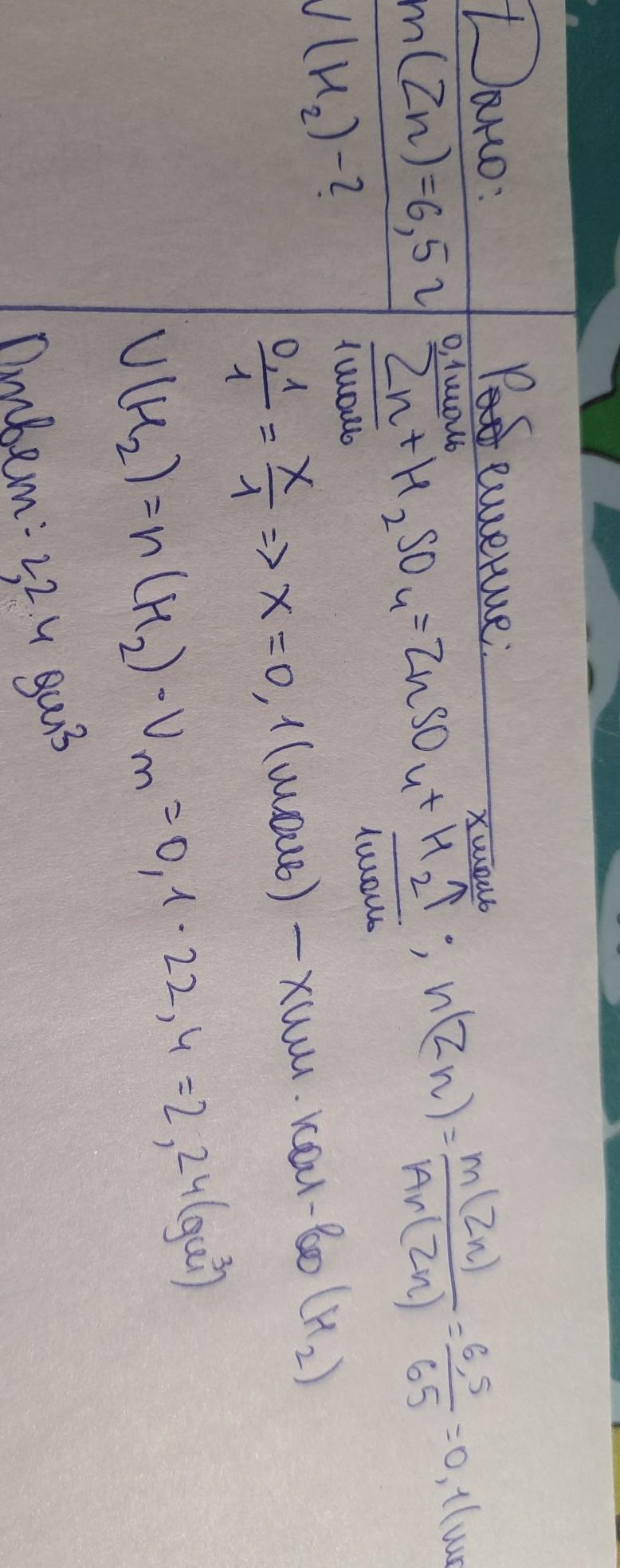 4. Задача. Какой объем водорода (н. у.) можно получить при взаимодействии цинка массой 6,5 г с раствором серной кислоты? (Zn + H2SO4 → ZnSO4 + H2 )