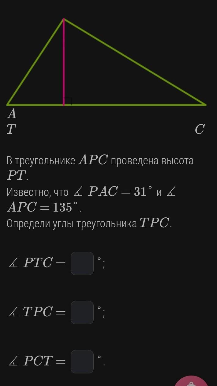 РТ высота, проведенная к стороне АС. Значит Угол АТР прямой, т.е. 90°.