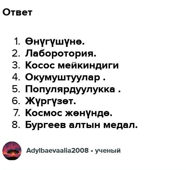жатышат. 2. Бүткүл дүйнөлүк окумуштуулар ... космоско ... жүргүзүшкөн. 3. ... ... бардык изилдөөчүлөрдү кызыктырган. 4. Биздин ... Ж. А. Бургеев башкы конструктор болгон. 5. Ал ондогон ... жасап, ... ... ээ болгон. 6. Конструктордун космос жөнүндөгү ...
