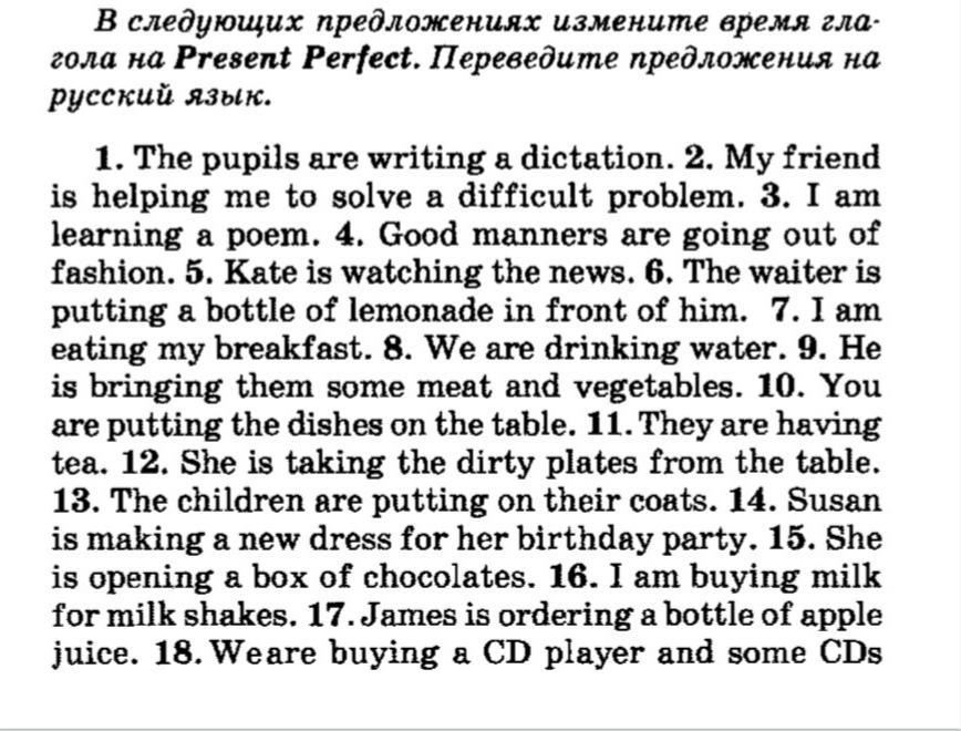 Ответ: 1. Ученики пишут диктант. 2. Мой друг помогает мне решить сложную проблему. 3. Я учу стихотворение. 4. Хорошие манеры выходят из моды. 5. Кейт смотрит новости. 6. Официант ставит перед ним бутылку лимонада. 7. Я завтракаю. 8. Мы пьем воду. 9. Не приносит им немного мяса и овощей. 10. Вы ставите посуду на стол. 11. Они пьют чай. 12. Она берет со стола грязные тарелки. 13. Дети надевают пальто. 14. Сьюзен шьет новое платье для своего дня рождения. 15. Она открывает коробку конфет. 16. Я покупаю молоко для молочных коктейлей. 17. Джеймс заказывает бутылку яблочного сока. 18. Мы покупаем CD-плеер и несколько компакт-дисков