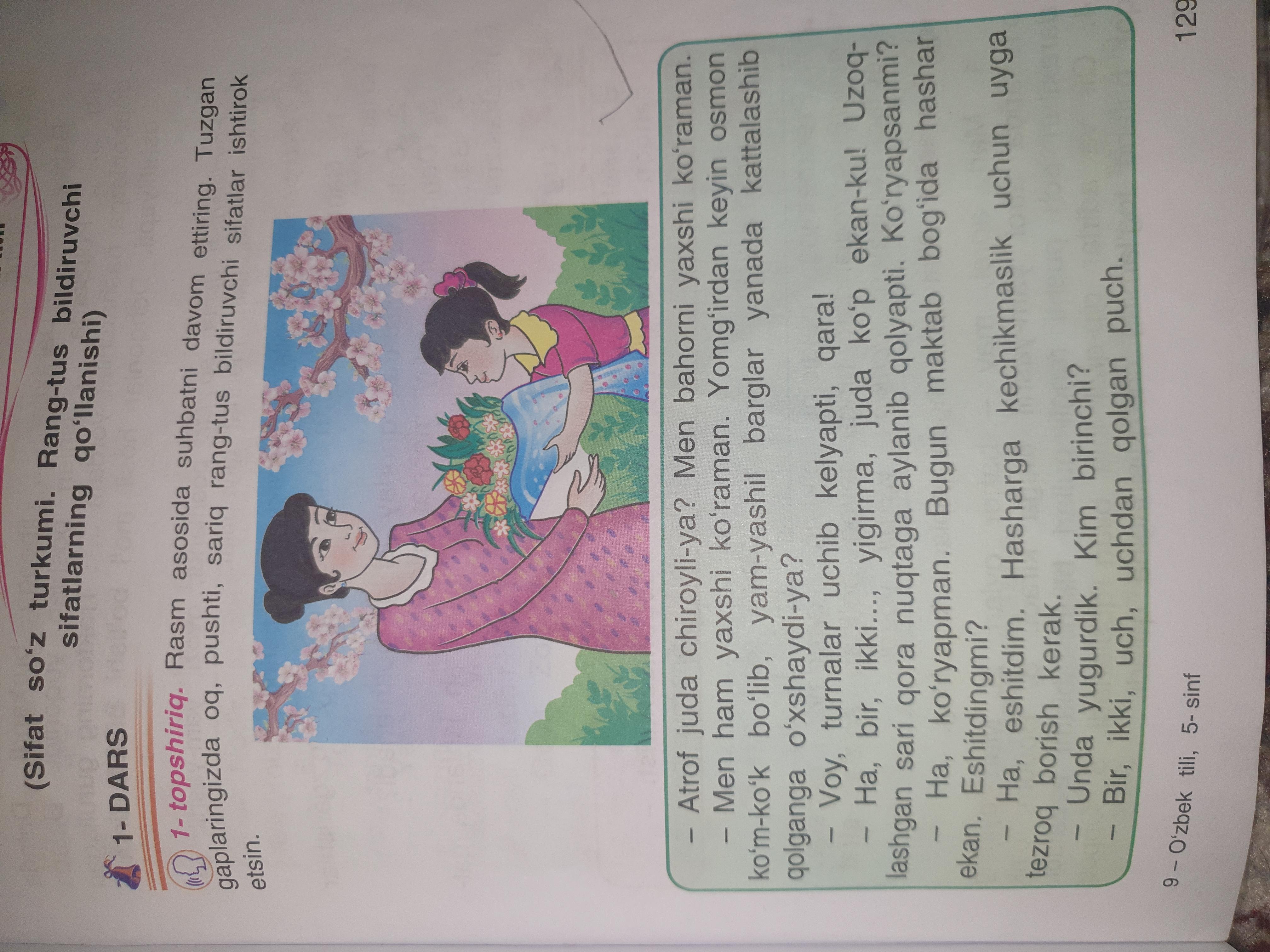 1-topshiriq. Rasm asosida suhbatni davon ettiring. Tuzgan gaplaringizga oq, pushti, sariq rang-tus bildiruvchi sifatlar ishtirok etsin