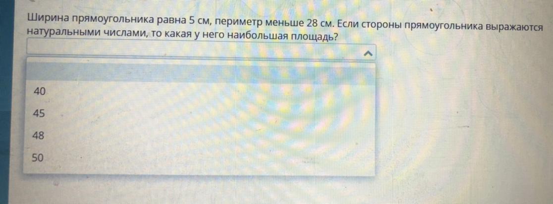 Ширина прямоугольника равна 5см, периметр меньше 28см. Если стороны прямоуголтника выражаются натуралтными числами, то какая у него наибольшая площадь?
