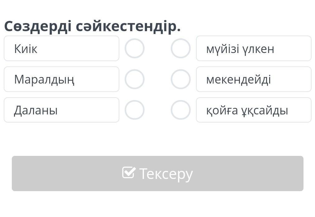 Бұл жауап дұрыс. Себебі, киік мүйізі үлкен деп айту қиын, олай айту үшін, киіктің мүйізі үлкен деп айтқанымыз жөн. Киік мекендейді деп те айту қиын, олай айту үшін, киік даланы мекендейді деп айтуымыз қажет. Сол себепті, киік - қойға ұқсайды деген тұжырым дұрыс. Маралдың қойға ұқсайды деп айта алмаймыз, маралдың мекендейді деп те айту қиын.Сол себепті, маралдың мүйізі үлкен деп айту ұйқасып тұр. Даланы мүйізі үлкен деп айта алмаймыз, даланы қойға ұқсайды деп те айталмаймыз. Сол себепті, даланы мекендейді деген жауап дұрыс.