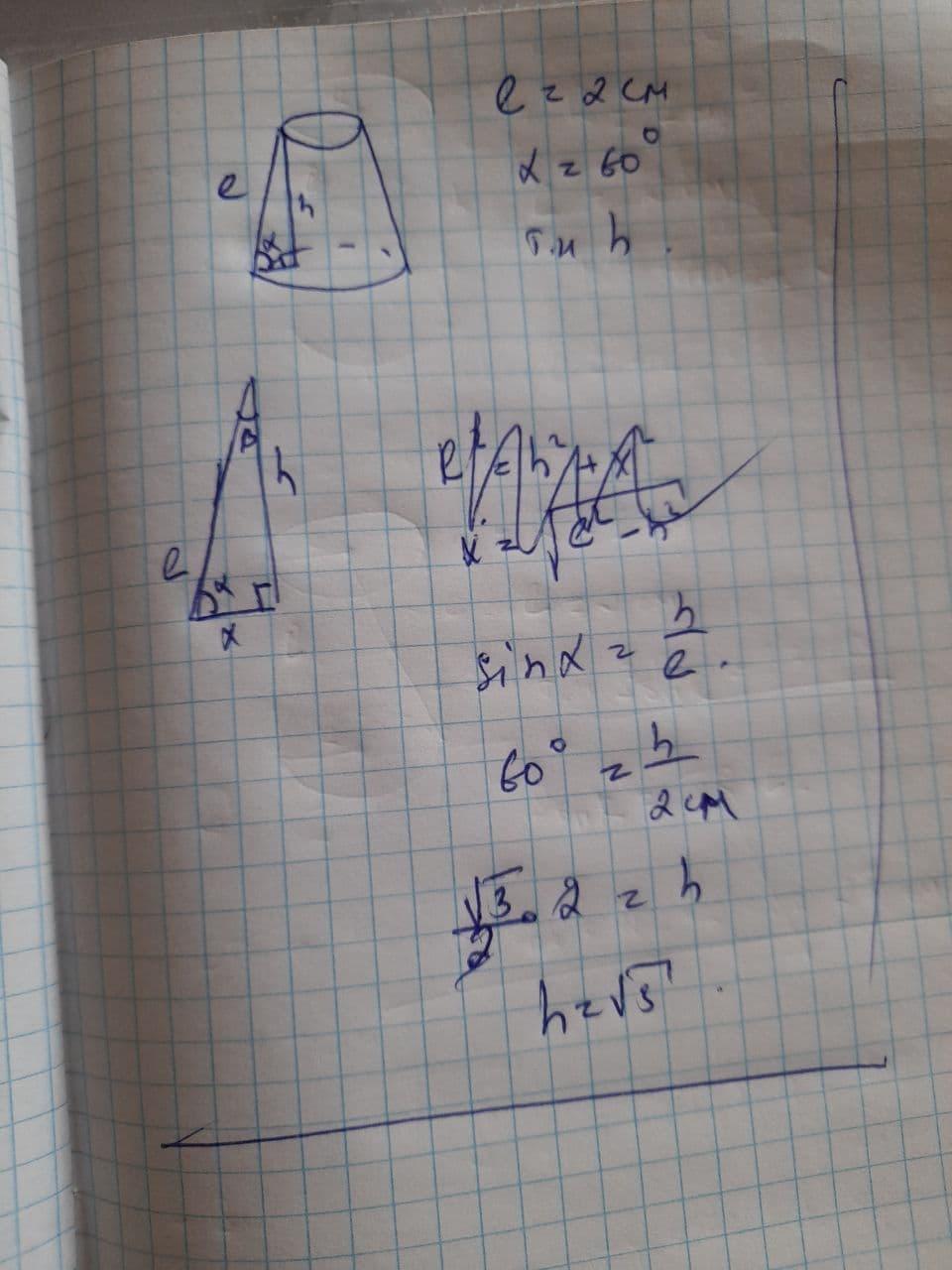 образующая усеченного конуса равна 2 см и наклонена к плоскости основания под углом 60°. Найдите высоту этого усеченного конуса .