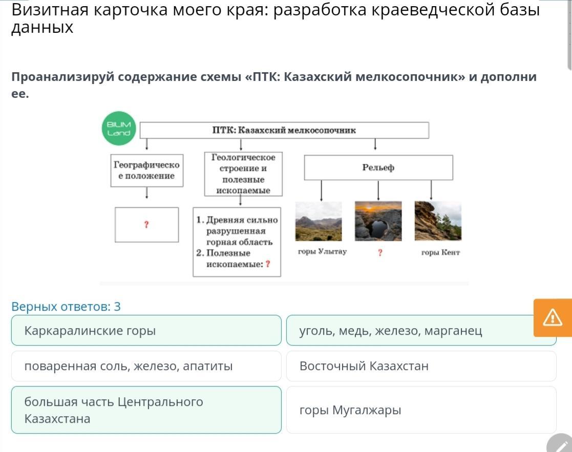 Проанализируй содержание схемы ПтК Казахский мелкосопочник и дополни её верных ответов 3 горы Мугалжары повареная соль железо апатиты Восточный Казахстан уголь медь железо марганец