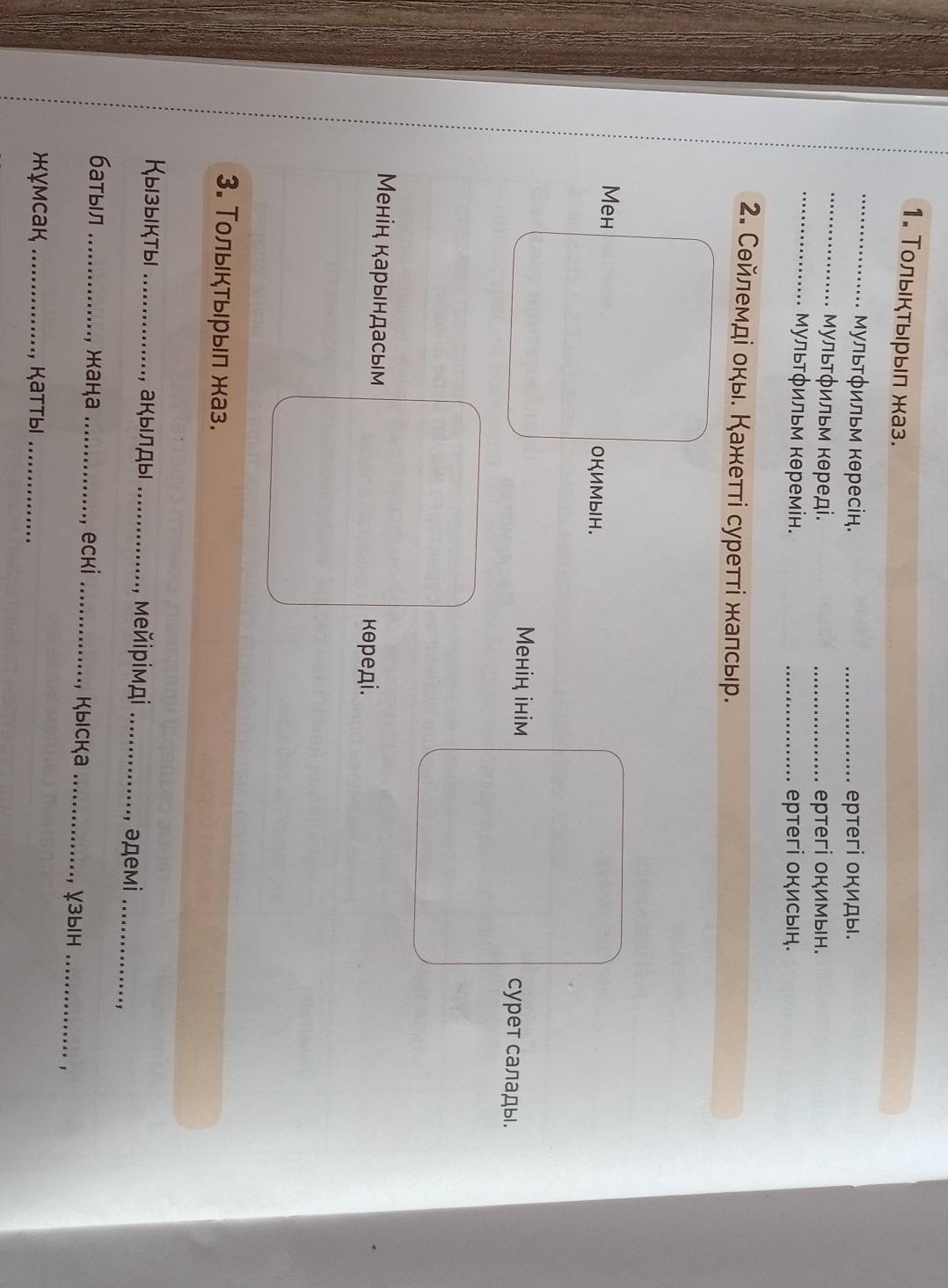 мен китап окимын.Менин иним кушти сурет салады.Менин карындасым мультфильм кореди.