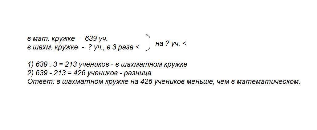 всем привет как вы знаете что с понедельником по пятницам мы используем Brainly так начнём. В доме школьников в математическом кружке занимаются 639 учеников ,а в шахматном -в 3 раза меньше на сколько меньше учеников занимаются в шахматном кружке? Запишите Условие задачи пжжж