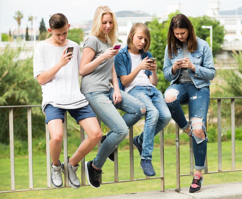 На данной фотографии изображены подростки. Они гуляют в парке. У двух ребят выражение лица довольное. У двух других лицо задумчивое, возможно даже грустное. Они сидят в телефоне. Играют в игры или общаются с друзьями...
