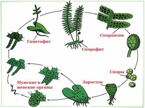 Бесполое размножение папоротника происходит благодаря образованию новых ростков на корневище, а половое сопровождается оплодотворением яйцеклетки спермием на заростке с последующим образованием зиготы и взрослого растения. После оплодотворения образуется зигота и, в последующем, семечко.