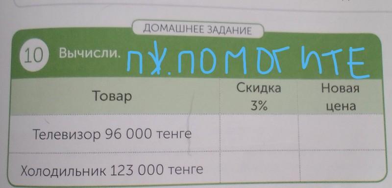 Краоче находим одни процент :96000:100=960 один процент умножаем 960 на 3 =2880 тг скидка и новая цена 96000-288093 120 новая цена телевизора дальше холодильник так же123000:100=1230•3=3690 вот ответ