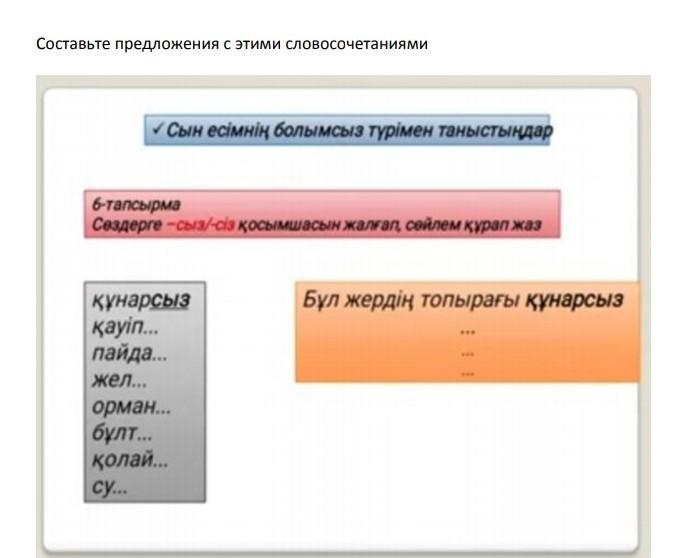 Бұл жер қауіпсіз. Пайдасыз заттан арыл. Ормансыз қалалар көп. Аспан бұлтсыз болмайды. Қазір қолайсыз уақыт. Сусыз тіршілік жоқ.