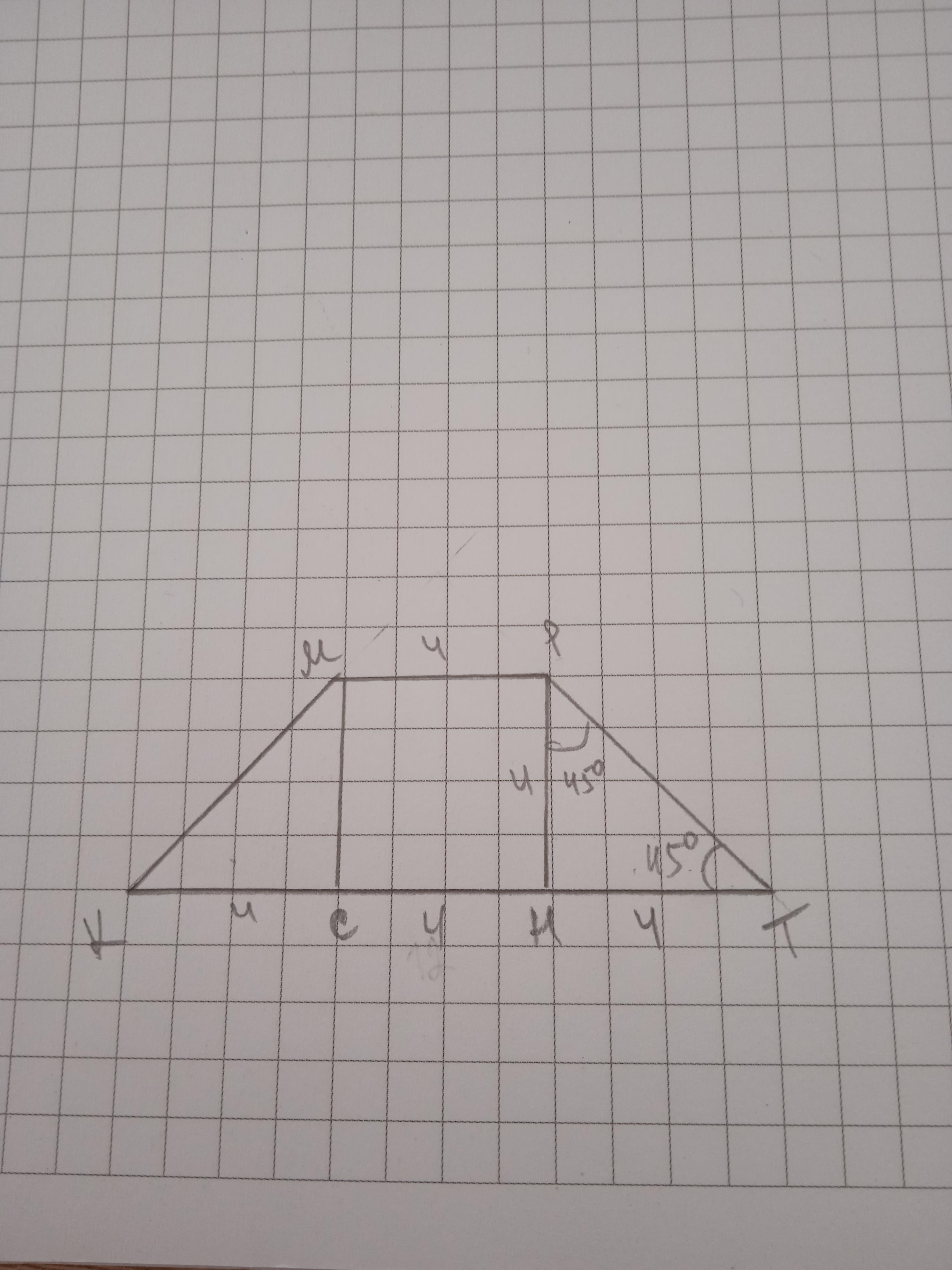 Дано: КМРТ - трапеция, КМ=РТ, ∡МРТ=135°, КТ=12 см, РН=МС=12:3=4 см. Найти S(КМРТ).