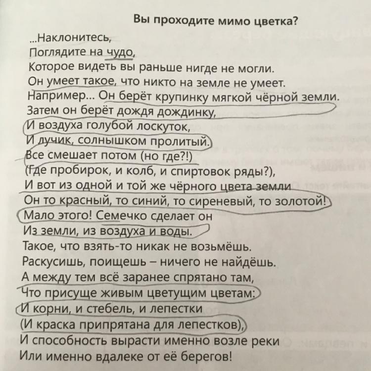 Чудо, цветы, чёрная земля, дождь, воздух, солнце, семя, воздух, всё спрятано, корни, стебель, лепестки, река, берег.