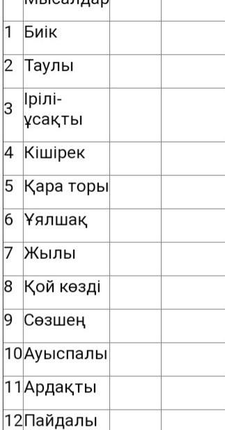 Биік-аласа,таулы-таусыз,ірілі-ұсақты-кішкентай,кішірек-үлкенірек,қара-торы-ақ торы,ұялшақ-пысық,жылы-суық,қой көзді-қоғыр көзді,сөзшең-аз сөйлегіш,ауыспалы-ауыспайтын,ардақты-мейірімді,пайдалы-пайдасыз.♥♥♥