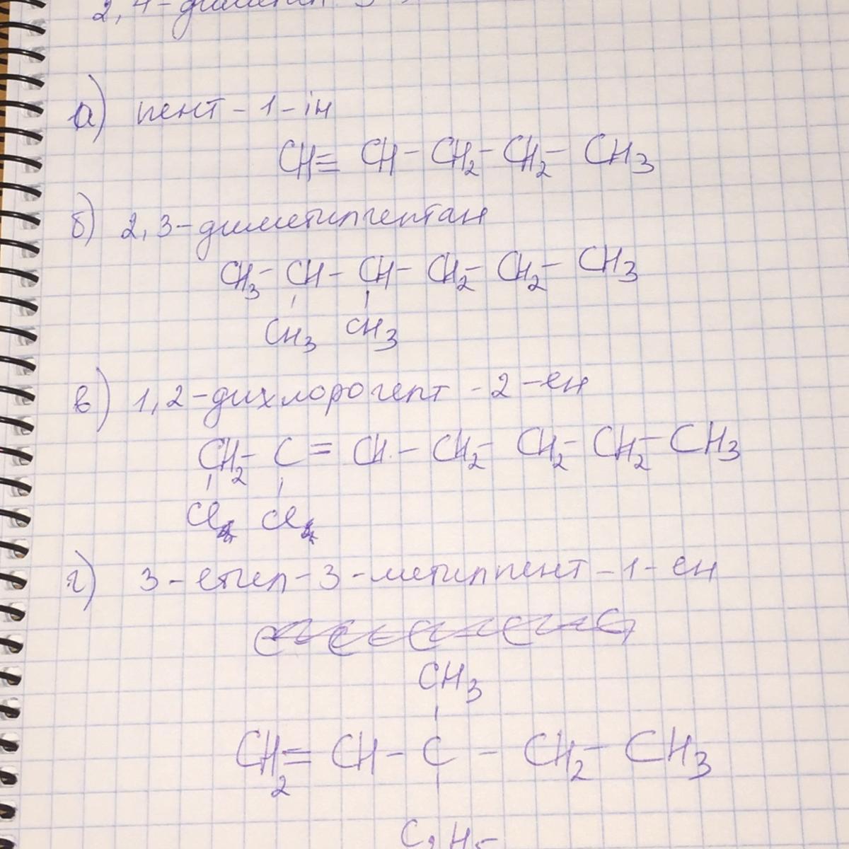 а) пент- 1 -ін б) 2,3 -диметилгептан в) 1,2-дихлорогепт 2 ен г) 3- етил -3 метил пент -1 --ен. Складіть структурні формули