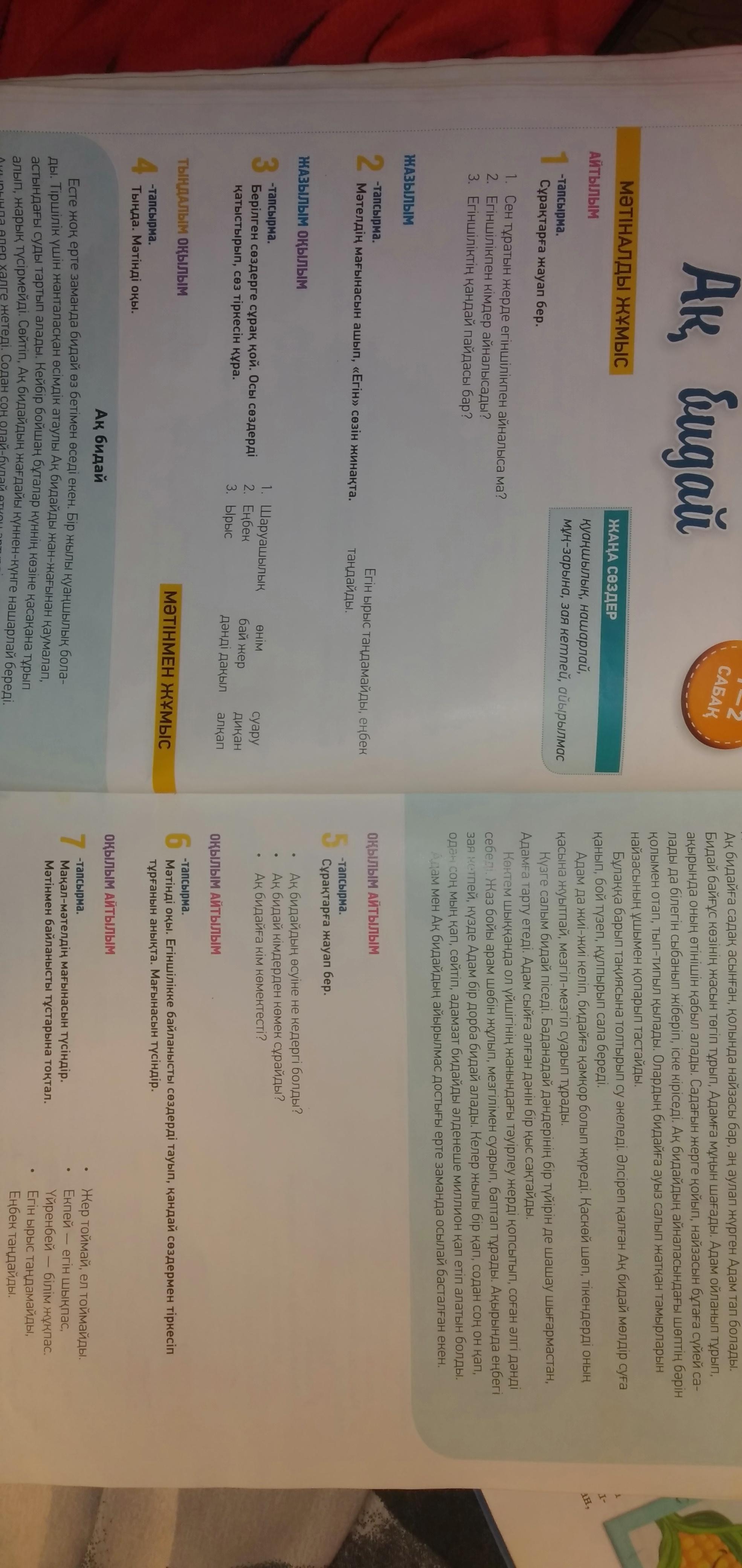2) Ақ бидай олай-бұлай өткен әртүрлі аңдардан,үстінен әрлі-берлі қалықтап ұшып жатқан құстардан және ең соңынан аң аулап жүрген Адамнан көмек сұрайды.