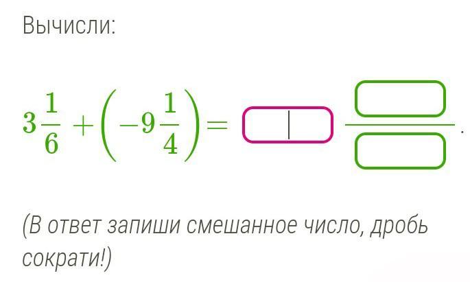3 1/6 + ( - 9 ¼ ) = 19/6 - 37/4 = (38-111)/12 = - 73/12 = - 6 ¹/¹²