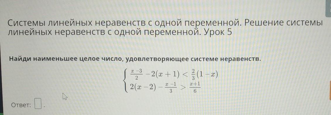 Найди наименьшее целое число, удовлетворяющее системе неравенств.