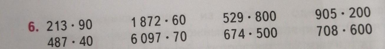 213*90=19170 487*40=19480 1872*60=112 320 6097*70=426790 529*800=423 200 674*500=337 000 905*200=181 000 708*600=424 800.