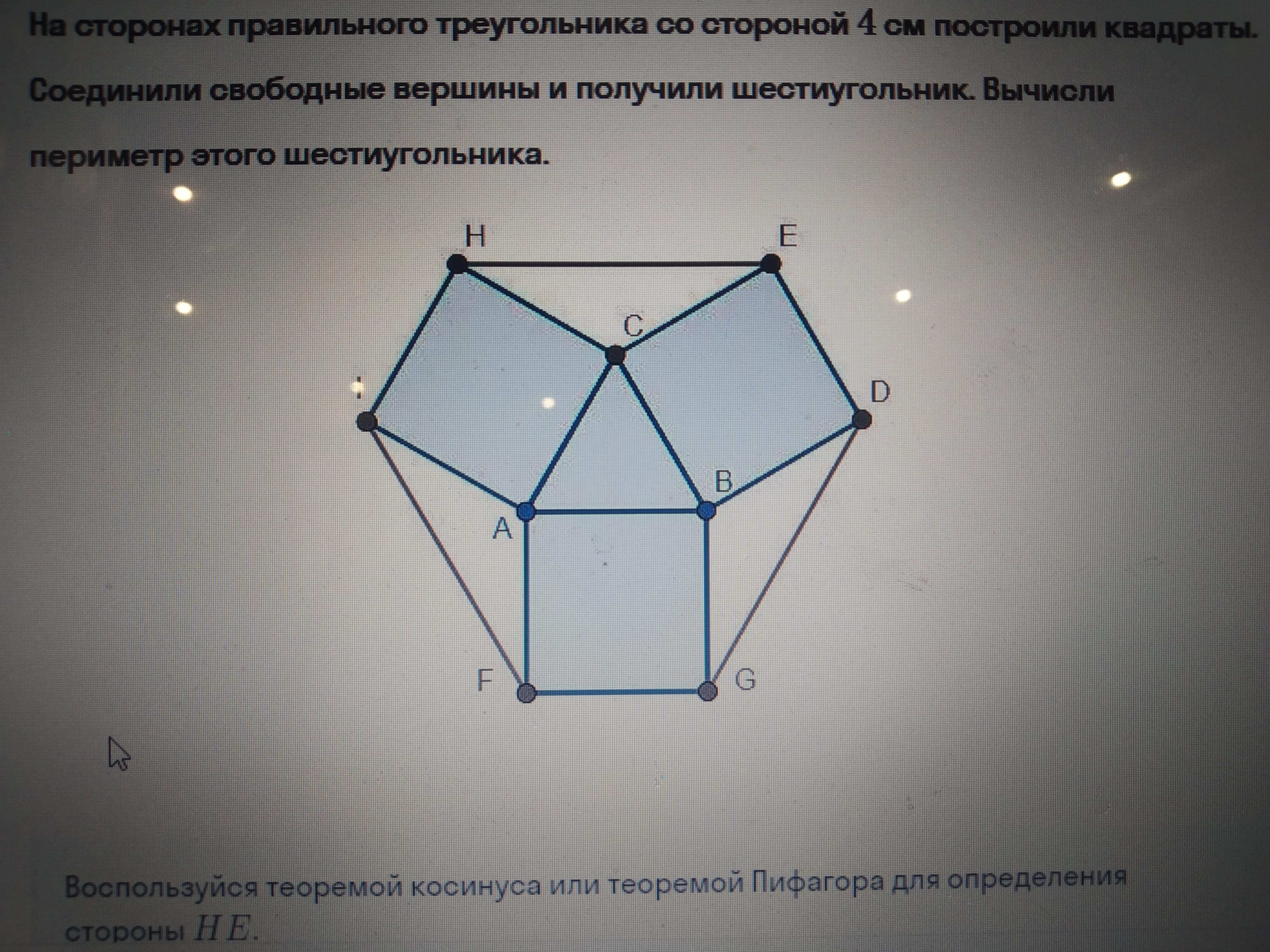 НЕ^2=HC^2+CE^2-2*HC*CE*cos <HCE=4^2+4^2-2*4*4*(-1/2)=16+16+16=48