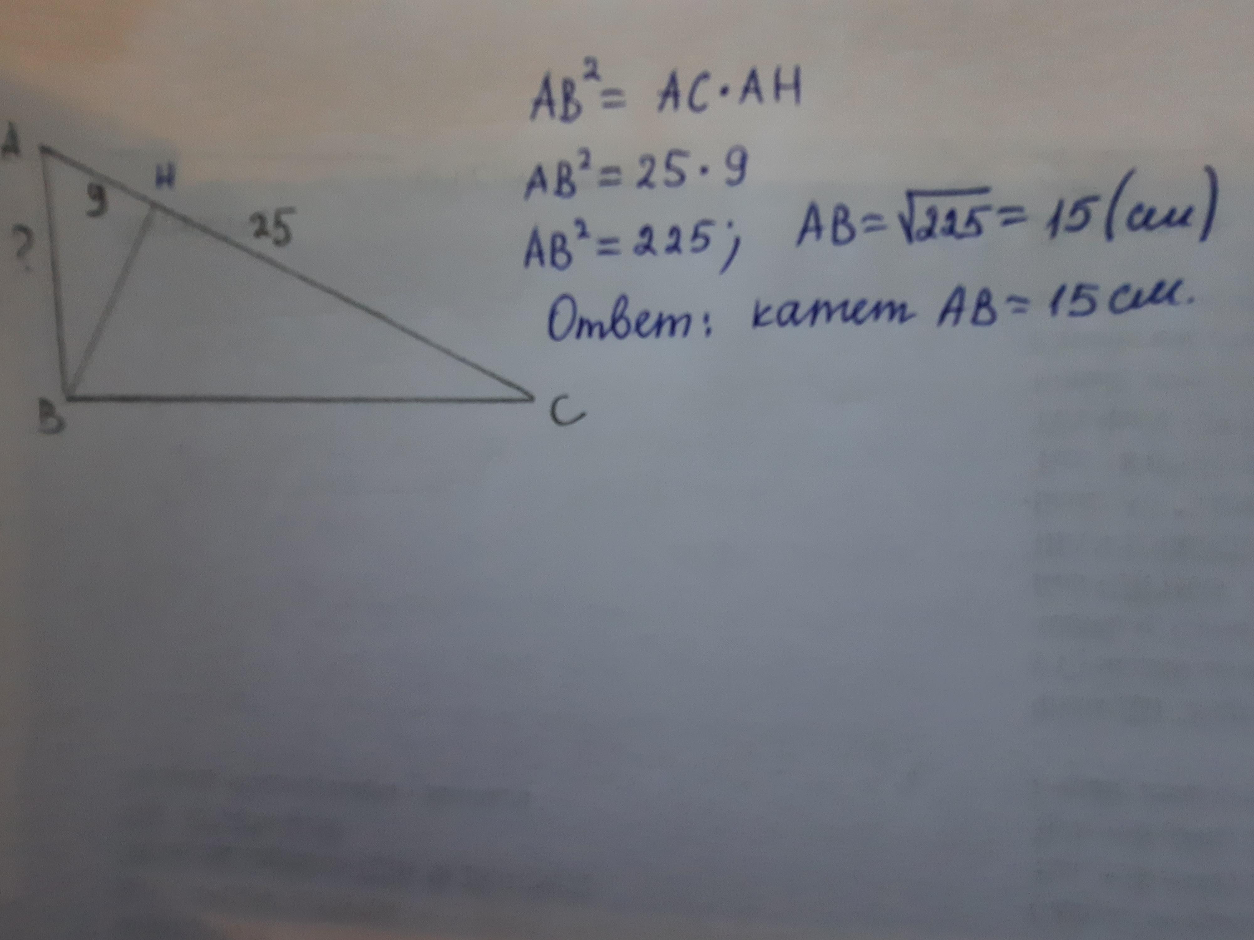 Найдите катет прямоугольного треугольника, если его гипотенуза равна 25 см, а проекция этого катета на гипотенузу равна 9 см.
