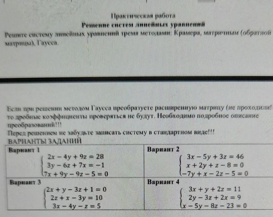 решите систему линейных уравненийтремя методами: крамера,матричным,гаусса.