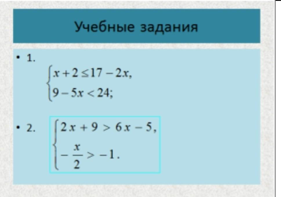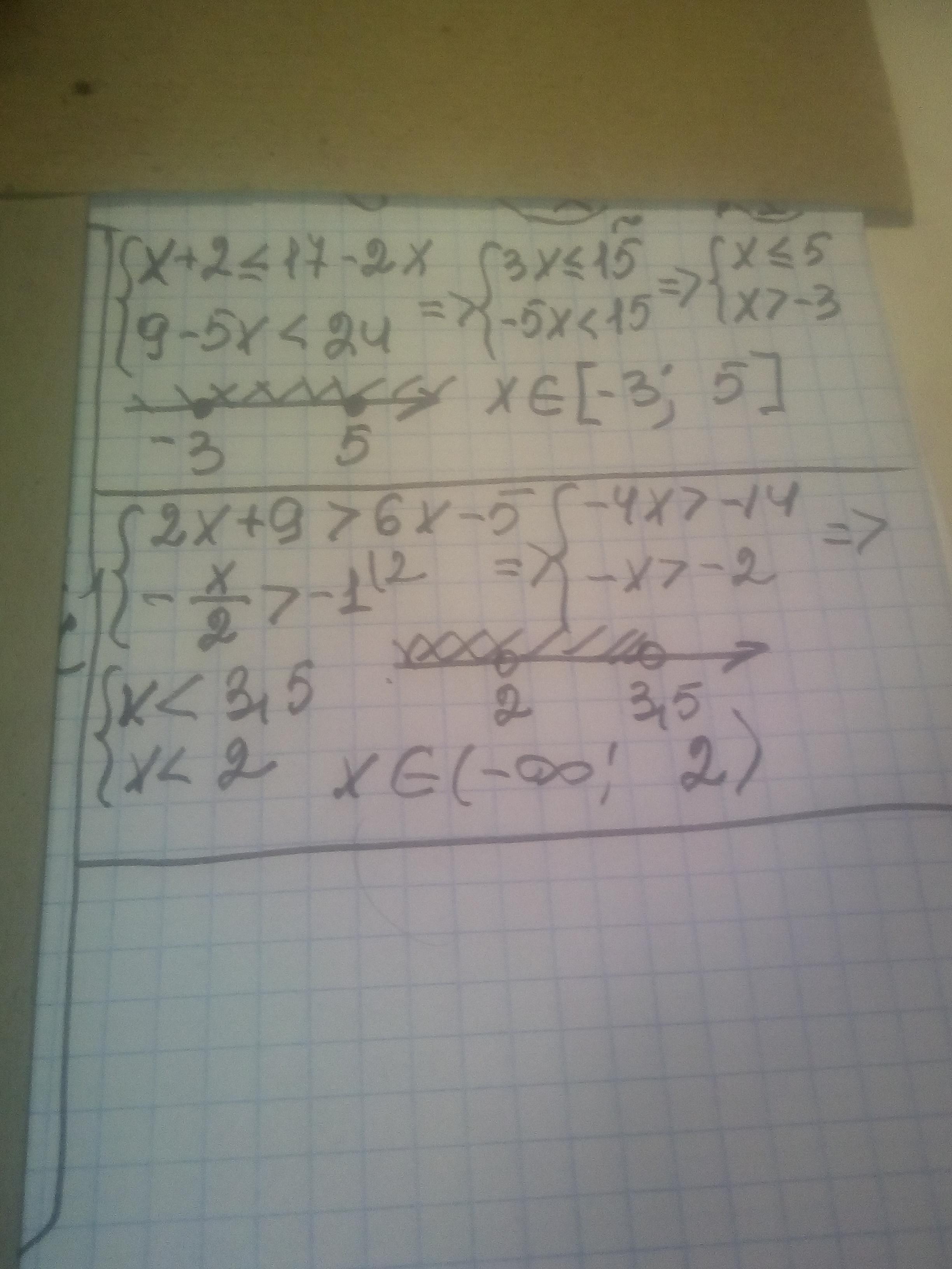 {2x + 9 > 6x - 5 { 2x - 6x > -5 -9 { -4x > -14 { x < 3.5