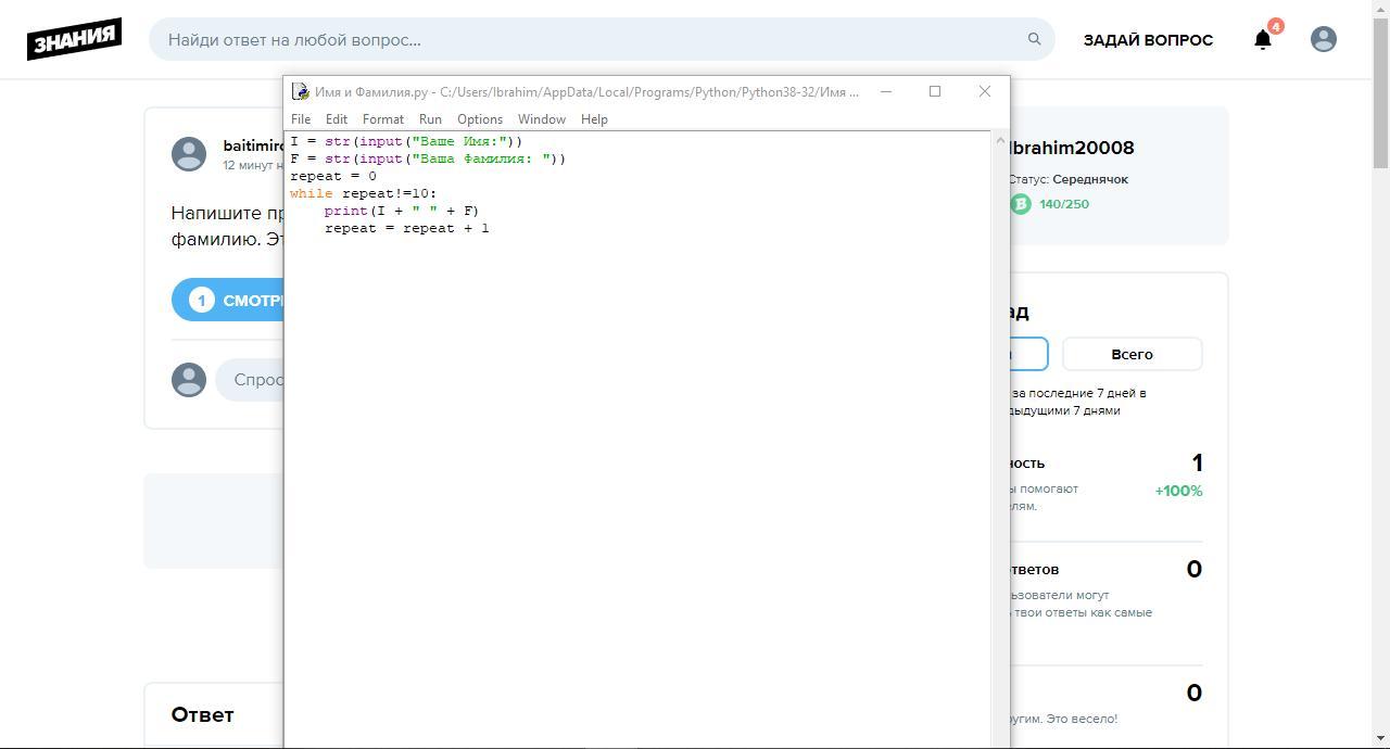 Напишите программу, которая 10 раз выводит на экран ваши имя и фамилию. Это должно быть на Пизон и пожалуйста скиньте фото