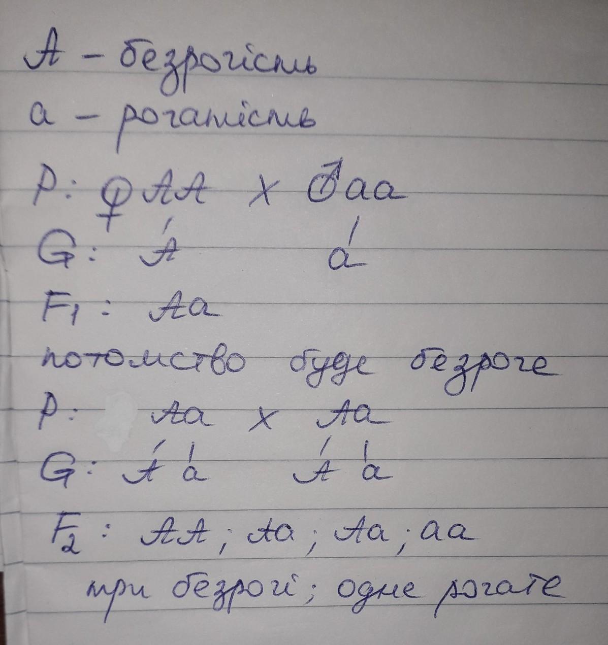 Ген безрогості домінує над геном рогатості. а)яке потомство буде F1 від схрещування рогатого бугая з гомозиготними безрогими коровами? б)Яким буде потомство F2 від схрещування таких гібридів? Дам 30 балів,хто напише на листку і прикріпить!