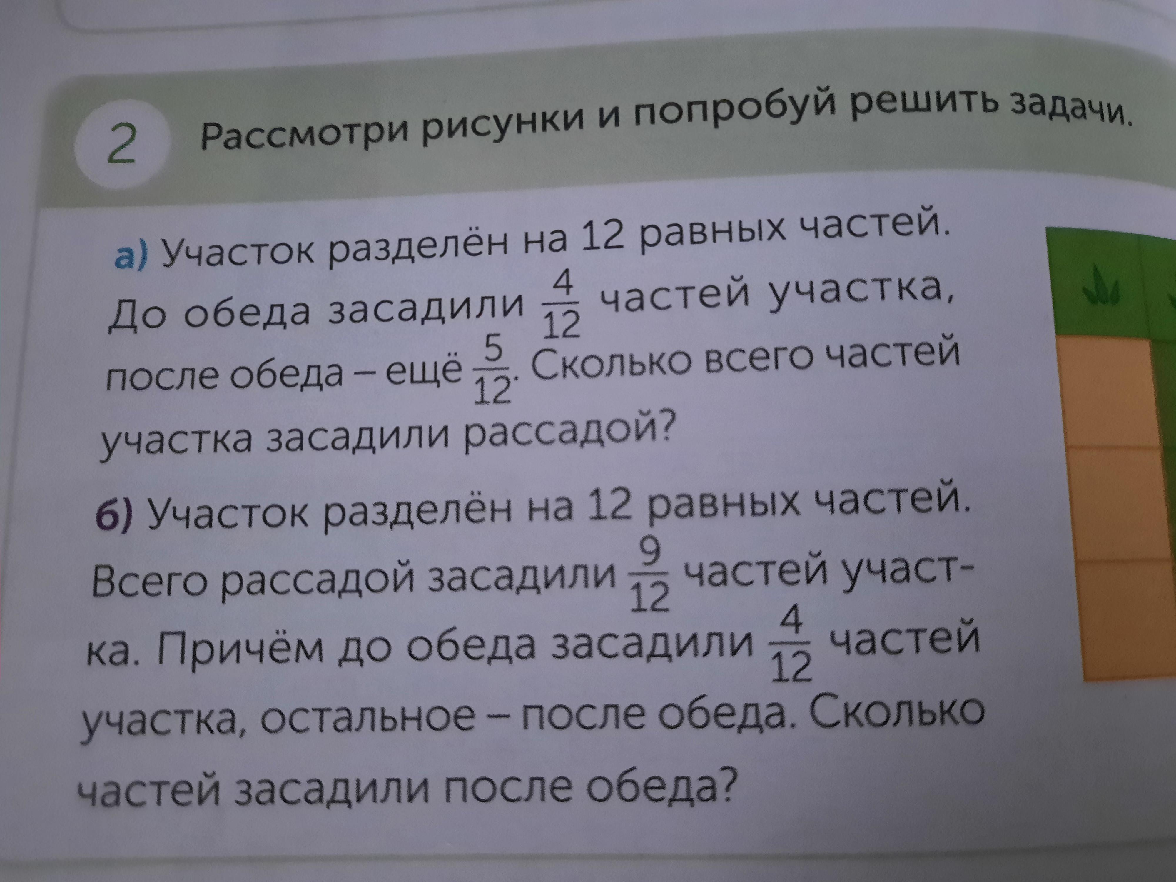 4/12 частей участка равно четвёртой части из общего количества частей, по аналогии, 5/12 частей участка равно пятой части из общего количества частей.
