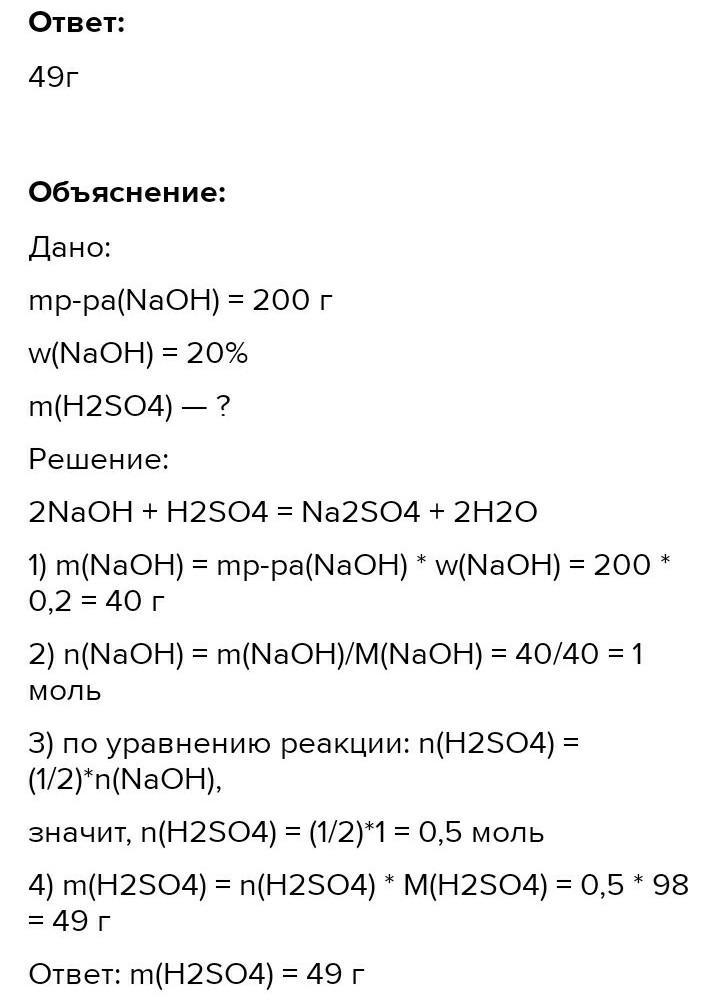 Вычислите массу серной кислоты, необходимой для нейтрализации 200г 20%ного раствора гидроксида натрия