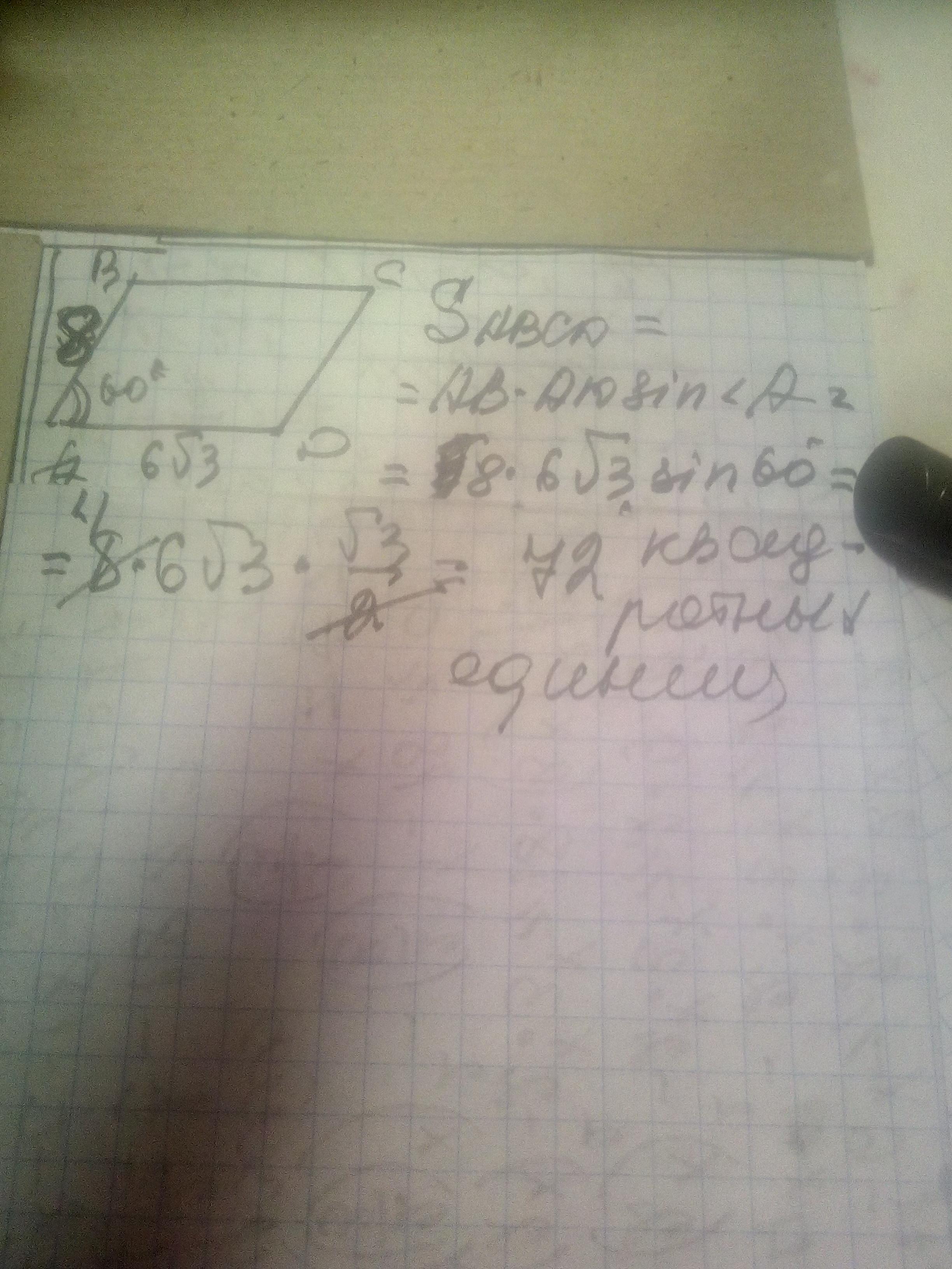 SOS 9 класс,кто не знает мимо в инете такого нет. одна из сторон параллелограмма=6√3,другая =8,а один из углов -60°.Найдите площадь параллелограмма. Даю 40 баллов