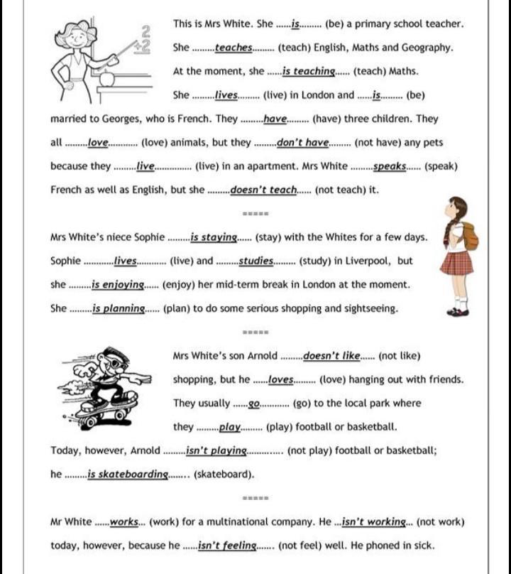 is, teaches, is teaching, lives, have, love, dont have, live, speaks, doesnt teach, is staying, lives, studies, is enjoying, is planning, doesnt like,