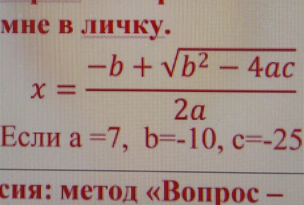 print("Ответ: ", -b + (math.sqrt(b**2)) - 4 * a * c)/2*a #Тут идет вычеслительный процесс, с использованием команды из модуля math, который добавил, math.sqrt - это квадратный корень, ** - это степень