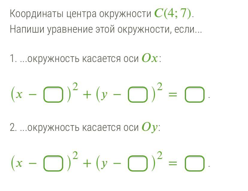 1) По условию O(4; 7), поскольку окружность касается оси абсцисс, то расстояние от центра окружности до точки касания с осью ОХ равно