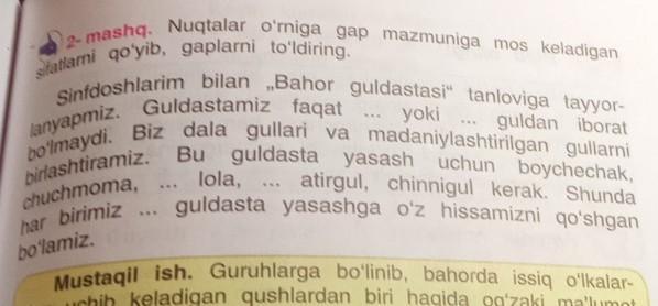 2- mashq. Nuqtalar oʻrniga gap mazmuniga mos keladigan