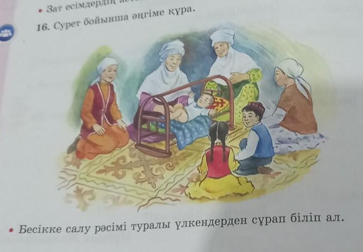 16.Сурет бойынша әнгіме құра. Бесікке салу рәсімі туралы үлкендерден сұрап біліп ал.