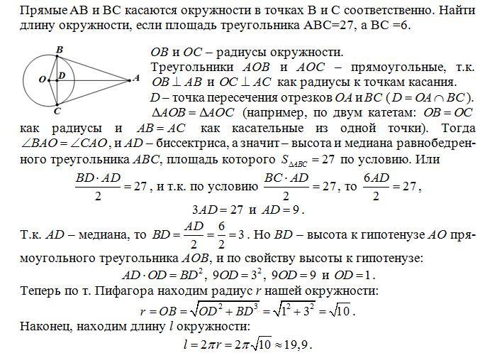 прямые AB и BC касаются окружности в точках B и С соответственно. Найти длину окружности, если площадь треугольника ABC=27, а BC =6. СРОЧНО!!!