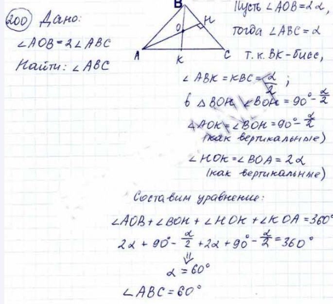 в треугольнике ABC бисектрисса BK и высота AH пересекаются в точке O. Угол AOB в 2 раза больше угла ABC. Найти угол