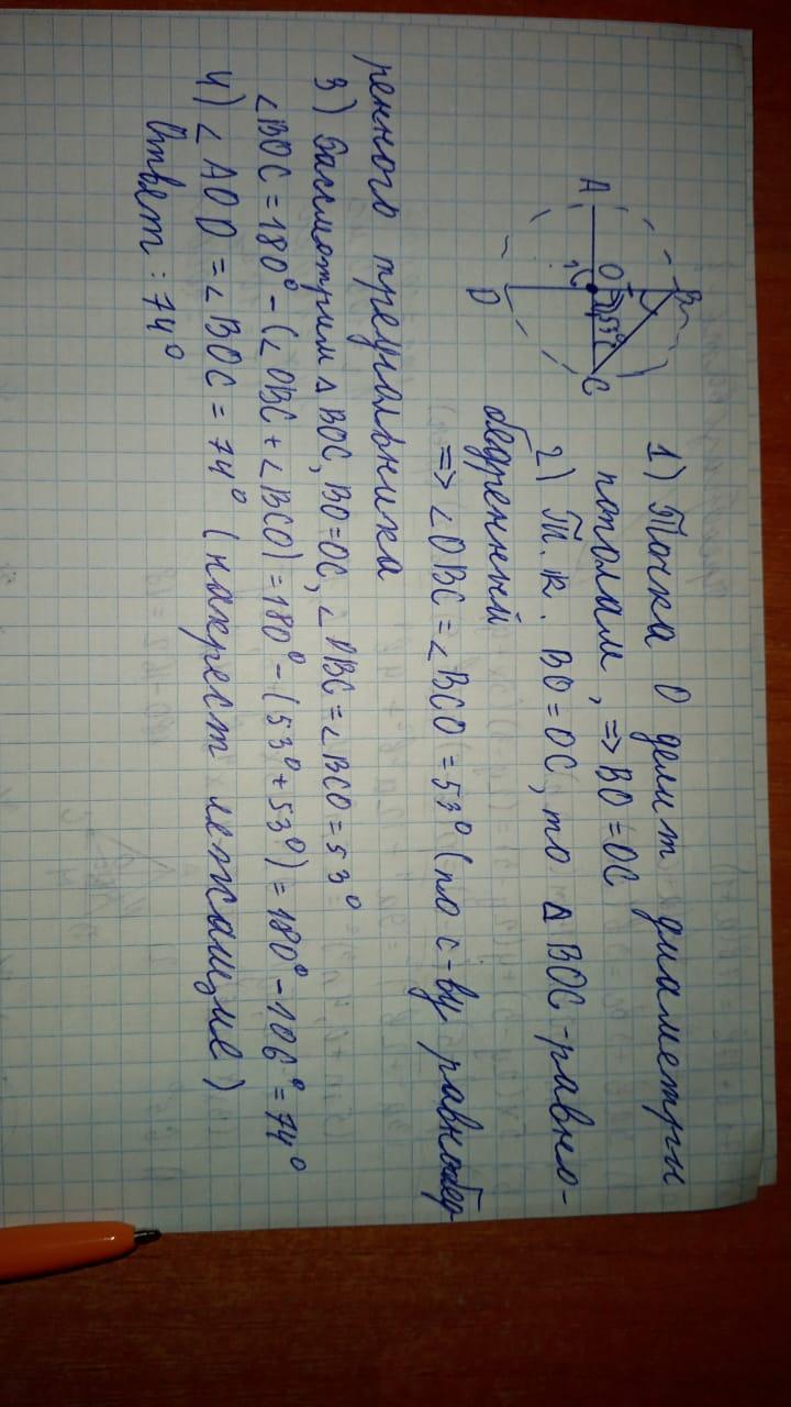 Отрезки AC и BD - диаметры окружности с центром 0. Угол ACB равен 53гр, Найдите угол AOD, Ответ дайте в градусах???
