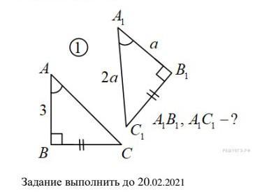 Треугольники ABC и A1B1C1 (прямоугольные) равны по катету и противолежащему углу (BC = B1C1, BAC=B1A1C1). Сторона длиной a соответственно равна стороне AB, поэтому A1B1=3, а A1C1=6.
