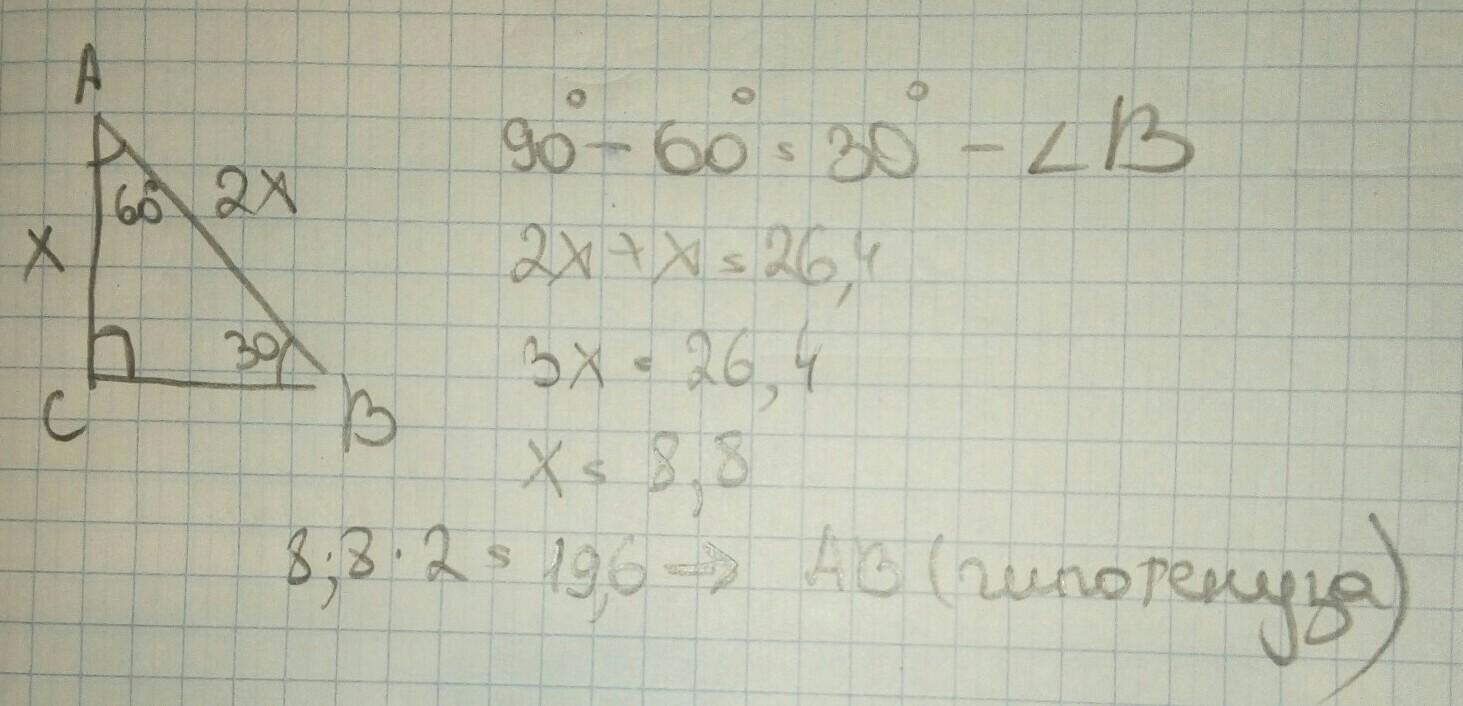 Пусть AC=x(см),AB=2x(см).Зная что сумма AC и AB=26,4 см,составляем уравнение: