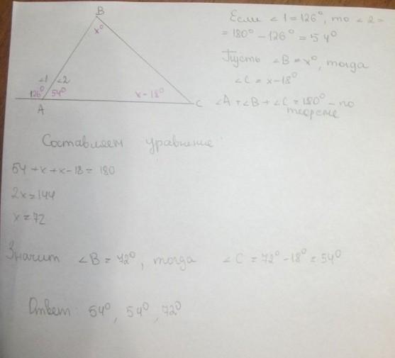 Один з внутришних кутів трикутника на 18° менший від другого, а зовнішний кут при вершині третього кута дорівнює 126° . Знайдіть кути трикутника