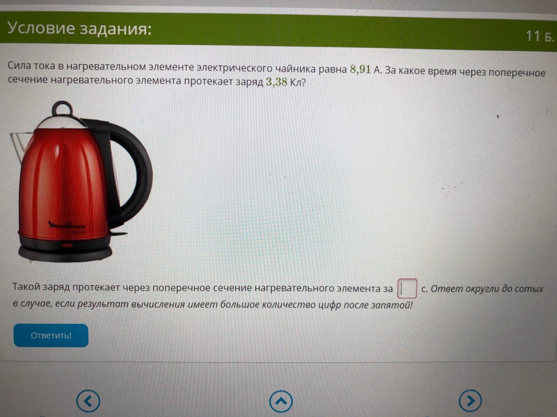 8,91 кулон за 1 сек., 3,38 кулон за Х сек. Х=3,38/8,91=0,379 сек.
