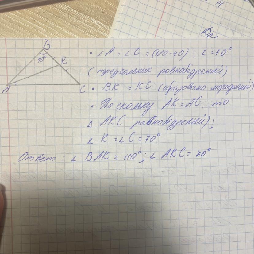 Т. К медиана делит угол пополам след. Угл=70:2=35