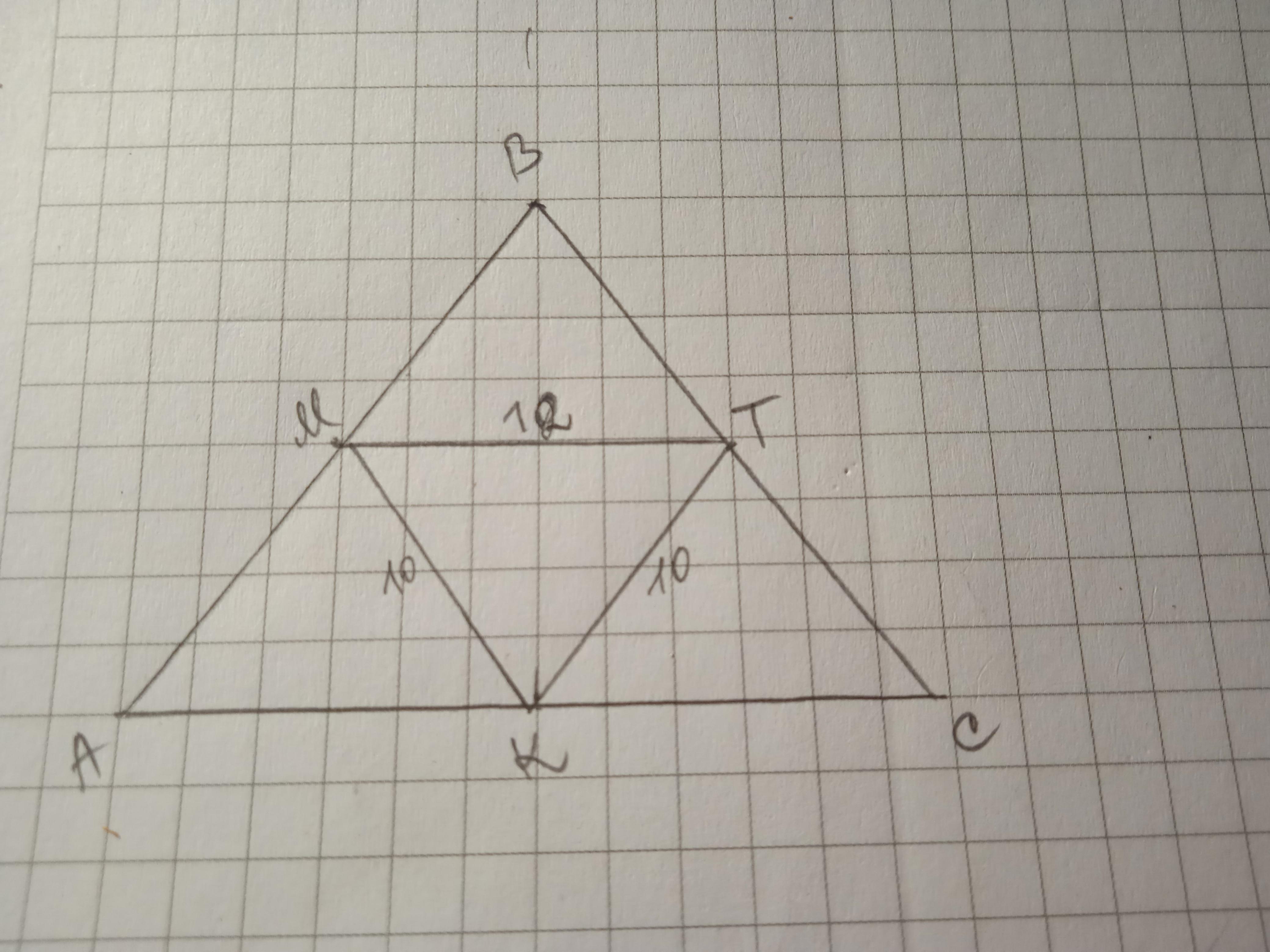 Дано: ΔКМТ, КМ=КТ=10 см, МТ=12 см.